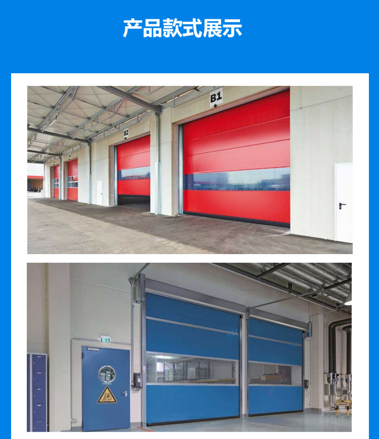 快速門采用高強度抗氧化鋁合金門框符合6063-T6標準,冷扎板靜電噴涂門罩、機箱。進口高密度聚脂纖維表面鍍膜處理,厚度0.8mm-1.5mm,顏色可選擇。